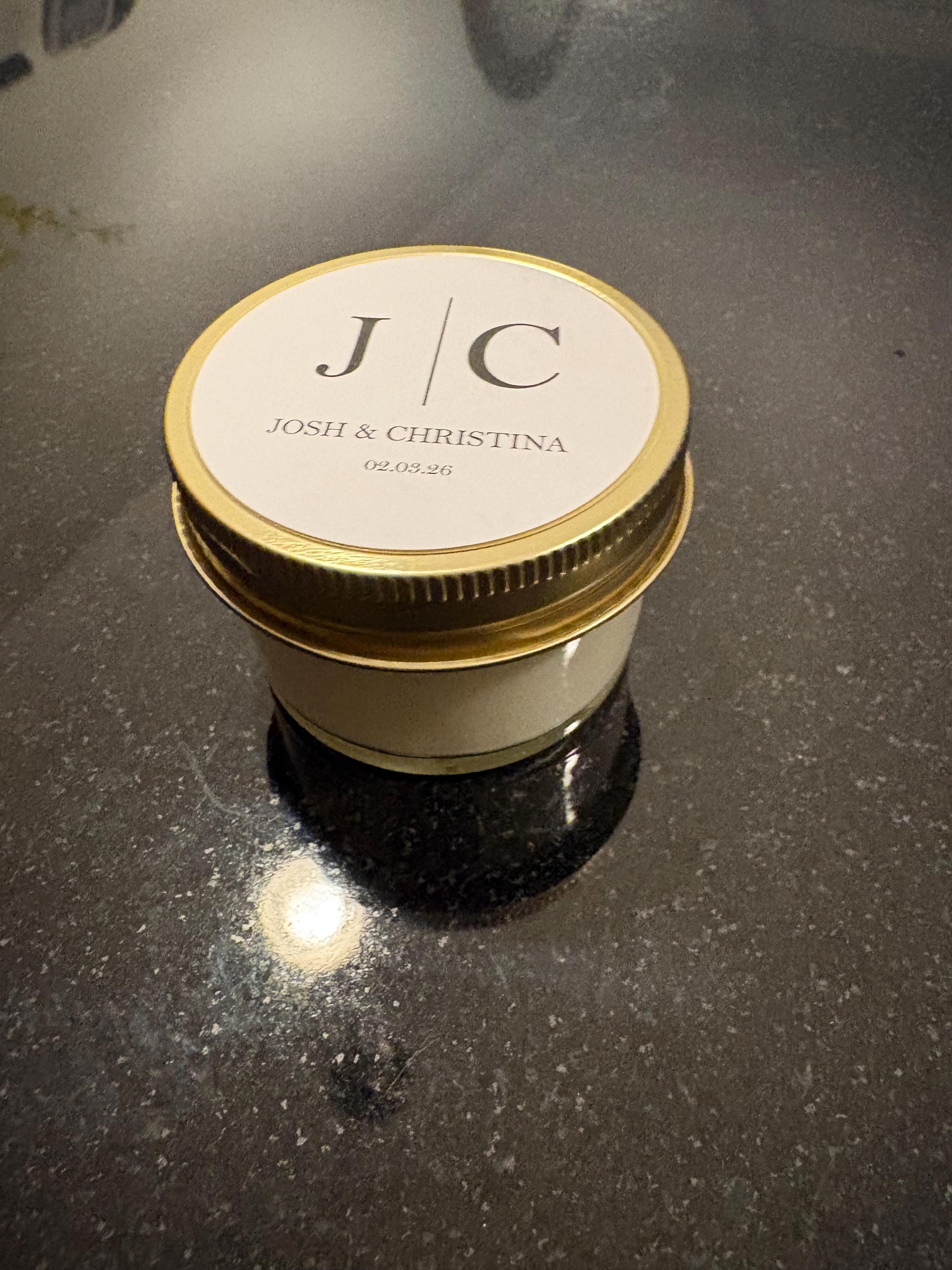 4 oz Jar Option: 4 oz candle jars in the scent of your choice, with either white or gold lids. They will arrive with personalized labels on the lids.